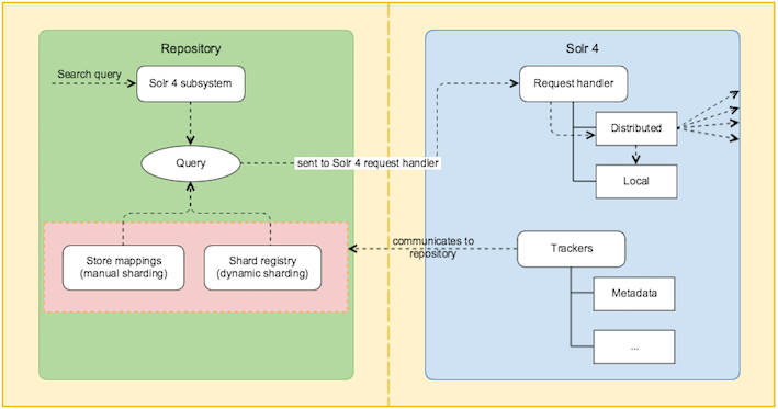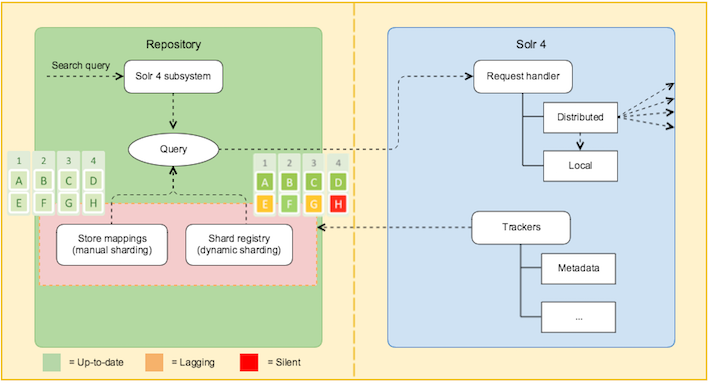 - Tracking tier: Two Solr instances periodically query repositories to detect new transactions, fetch new content, and build local indexes. Tracking is done through Solr load balancer, which analyses the load and distributes it across the repositories.