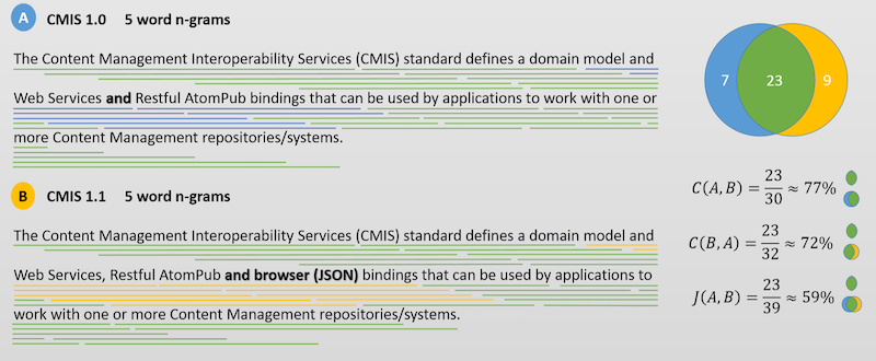 Here are two summaries of the 1.0 and 1.1 CMIS specification. It demonstrates, amongst other things, how sensitive the measure is to small changes. Adding a single word affects 5 shingles.