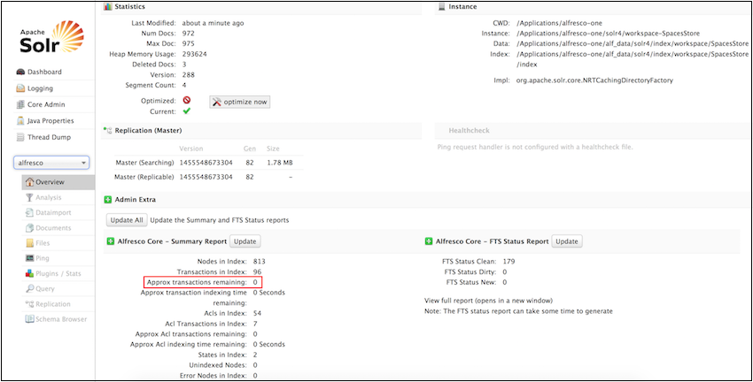 - Alfresco One 5.0 moved to Solr 4 and also introduced transaction metadata query (TMDQ). TMDQ was added specifically to support the transactional use cases that used to be addressed by the Lucene index in the previous versions. TMDQ uses the database and adds a collection of required indexes as optional patches.