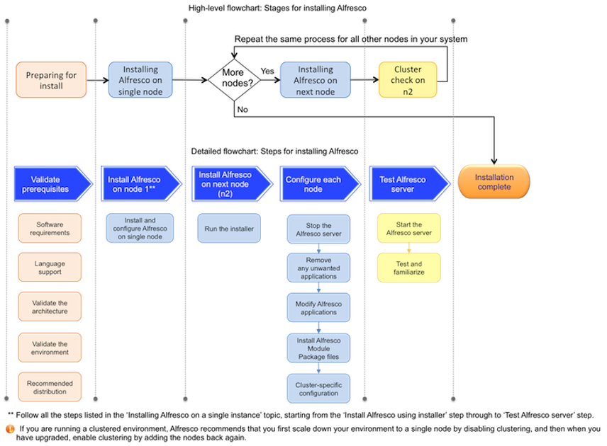 The main stages involved in installing Alfresco Content Services in a cluster are shown in the diagram. You must install and configure your data on a single node first and then on the second node, and so on.