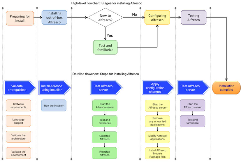 Note: Note that the steps shown in the diagrams have a colour code. For example, Preparing for install stage consists of five sub-steps, namely, Software requirements, Language support, Validate the architecture, Validate the environment, and Recommended distribution.