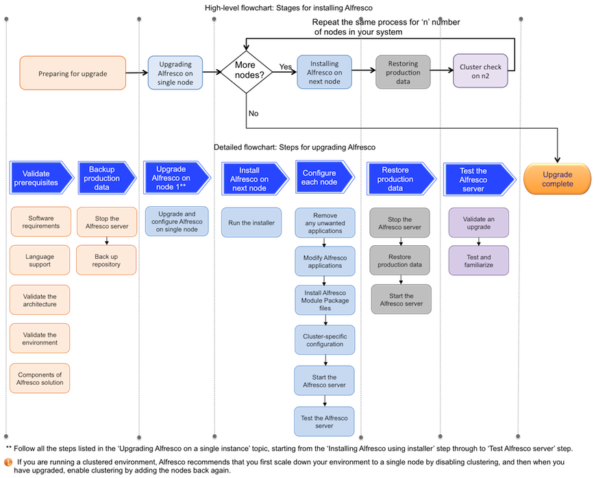 Follow this checklist when upgrading or clustering an installation of Alfresco Content Services. For detailed step-by-step instructions for upgrading see Upgrading Alfresco Content Services.