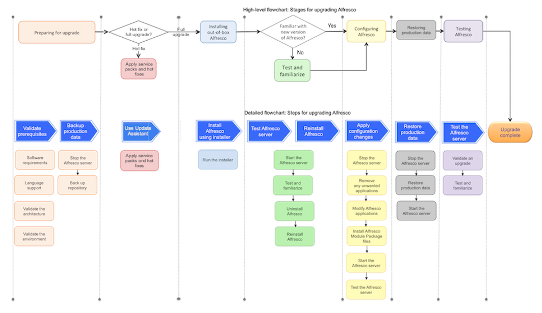 Note: Note that the steps shown in the diagrams have a colour code. For example, Restoring production data stage consists of three sub-steps: Stop the Alfresco Content Services server, restore production data, and start the server.