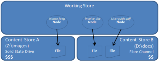 The content store selector provides a mechanism to control the physical location on disk for a content file associated with a particular content node. This allows storage polices to be implemented to control which underlying physical storage is used, based on your applications needs or business policies.