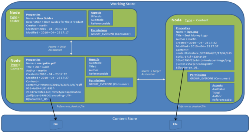 - Properties: both types and aspects define properties. If it is a file node then one of the properties points to the physical file in the content store.