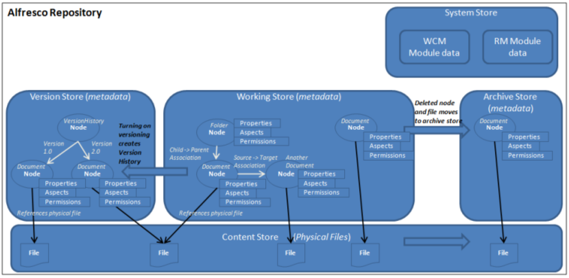 workspace://SpacesStore) contains the metadata for all active/live nodes in the Repository. This store is implemented using a database (RDBMS). - The Content Store contains the physical files uploaded to the Repository and is located in the