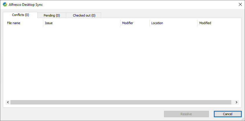 - Select Conflicts to view conflict-related information and resolve the conflict. The information displayed includes file name, the conflict or issue, modifier, location of the conflict, and details when the file was last modified.