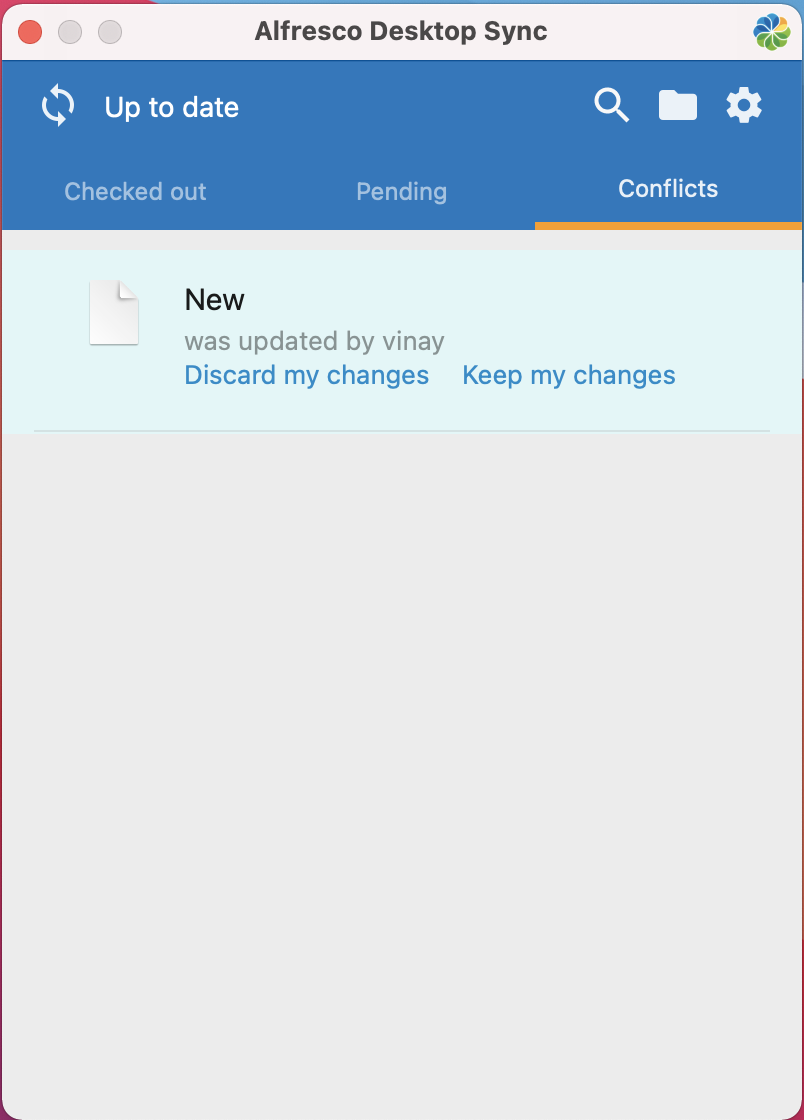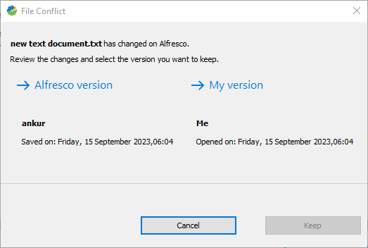 To resolve a conflict, choose which version to keep, Alfresco or your changes and click Keep: