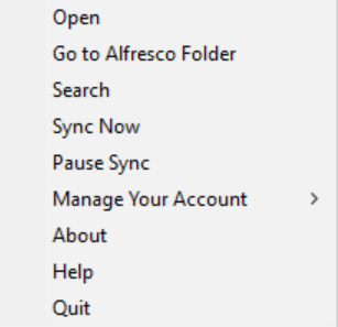 You can still access your files in Alfresco. Any content that can’t be removed from your desktop is orphaned. On removing your account you are taken back to the Desktop Sync login dialog. Close the login dialog to quit the application. See Setting up Desktop Sync.