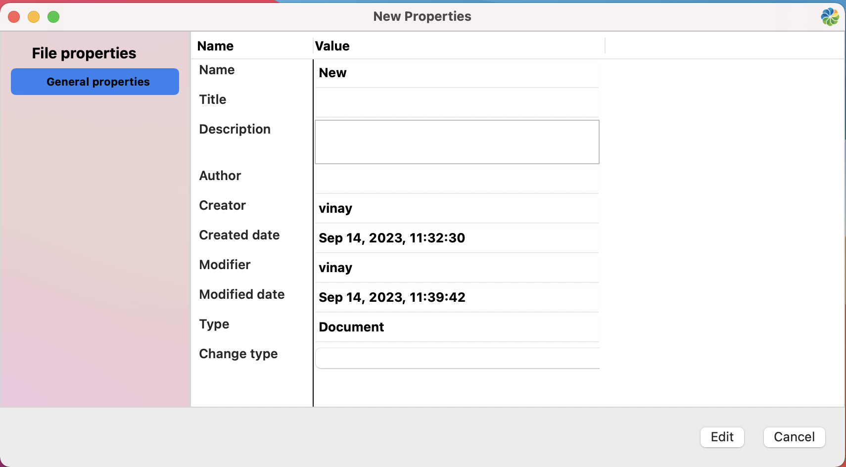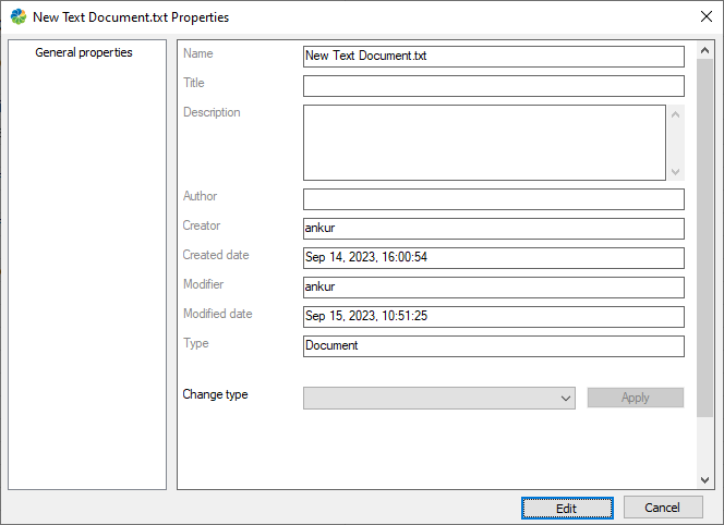 By default, you can view and edit general properties, such as Title, Name, Description, and Author (if you have the correct permissions).