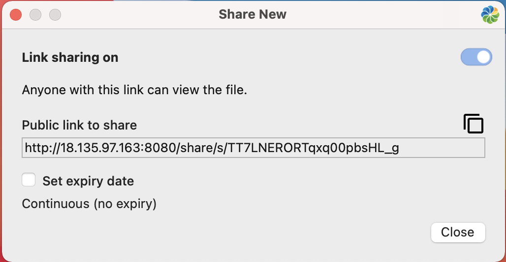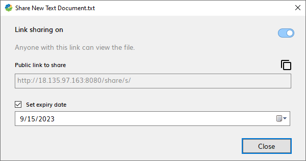 Note: If a file is record, link sharing is not allowed. If a file is read-only, the file can be shared but you can’t set an expiry date. However, if a read-only file was previously shared and had an expiry date, the date is displayed but can’t be changed (i.e. the field is read-only).