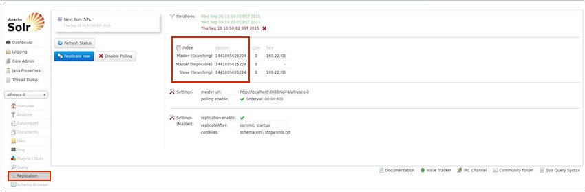The Replication screen shows the current replication status for the core, and lets you enable/disable replication. It also displays the version of the master and slave servers.