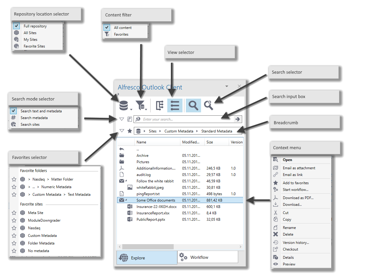 Note: In Alfresco Outlook Integration 2.7, the Explore tab is only available if the Workflow tab is also enabled to save space for more content. The Workflow tab is hidden by default.