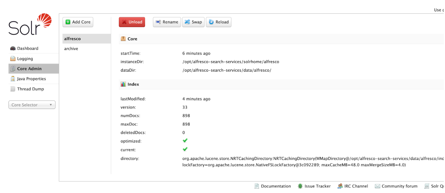 The buttons at the top of the screen enable you to add a new core, unload the core displayed, rename the currently displayed core, swap the existing core with one that you specify in a drop-down box, and reload the current core.
