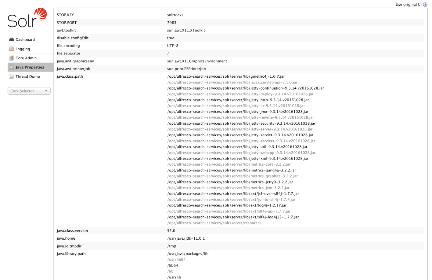 The Java Properties screen displays all the properties of the JVM running Solr, including the classpaths, file encodings, JVM memory settings, operating system, and more.
