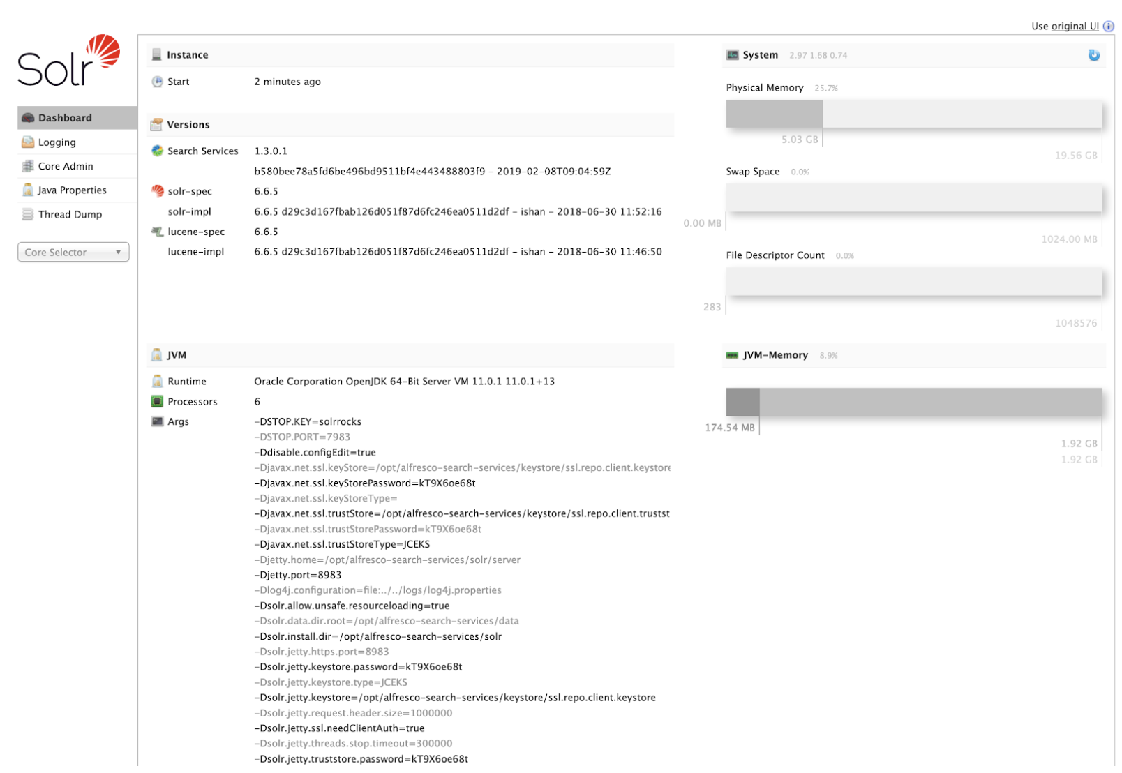 ssl.repo.client.keystorecontains a Solr public/private RSA key pairssl.repo.client.truststorecontains the trusted Alfresco Certificate Authority certificate (which has been used to sign both the repository and Solr certificates)